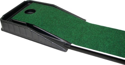 This one hole 9' putting green with non-skid backing features a continuous return of the ball to the putter. Balls return from cup (thru tunnel) and back and side gutters. Track allows continuous and direct return of ball with every shot. Use indoors or out for improving your game or just for fun! (Clubs & Balls Not Included).